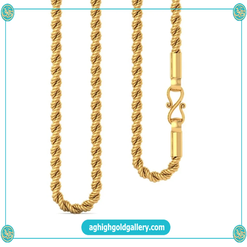 زنجیر تابیده، همانطور که از نامش پیداست، از رشتههای نازک طلا تشکیل شده است که به صورت مارپیچ به دور یکدیگر پیچیده شدهاند و ظاهری شبیه به طناب ایجاد میکنند