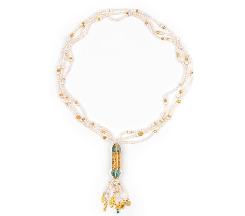طراحی سه رشته‌ای باعث می‌شود گردنبند جلوه‌ای پرجزئیات و لوکس پیدا کند، در حالی که قاب‌بندی طلای ظریف، استحکام و درخشش بی‌نظیری به آن می‌بخشد. این ترکیب زیبا، حس وقار، ظرافت و زیبایی طبیعی مروارید را دوچندان می‌کند.